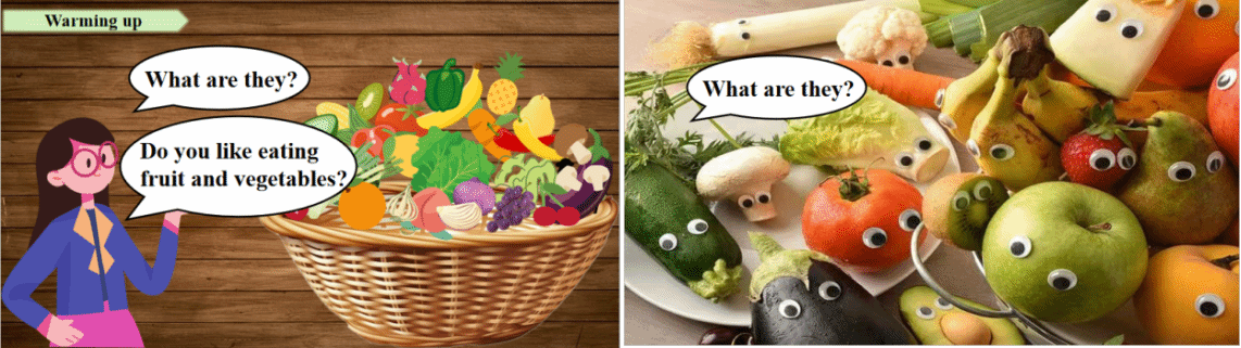 我们用水果蔬菜的图片引入,通过看图片说单词的方式激发员工对该话题的兴趣。但是在首版课件中,我们使用网络素材让员工回答,没有充分利用好课本里的图片素材,使课本素材被浪费。所以在修改之后,我们让员工观察教材图片并回答问题,这样不仅利用好教材资源,而且更合理地对员工的话题词汇进行了拓展。