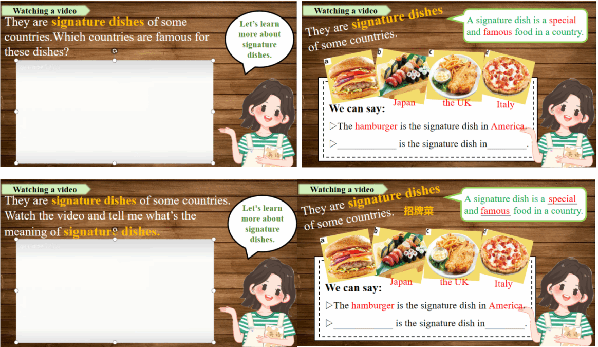 在解释本课关键词组signature dishes时,我们利用视频来进行更详细的解释。但是在首版课件中,对于这个词组的解释是在员工观看完视频后直接呈现的,这样的方式没有达到播放视频的目的,也缺少了让员工通过视频进行思考的过程。所以在修改之后,我们在播放视频前就先提出明确的任务”Watch the video and tell me what the meaning of signature dishes is?”,将问题前置,让员工带着问题观看视频,不仅可以提高员工的专注度,还可以加深员工对目标词组的理解,最后通过填空的方式展示出signature dishes的定义。