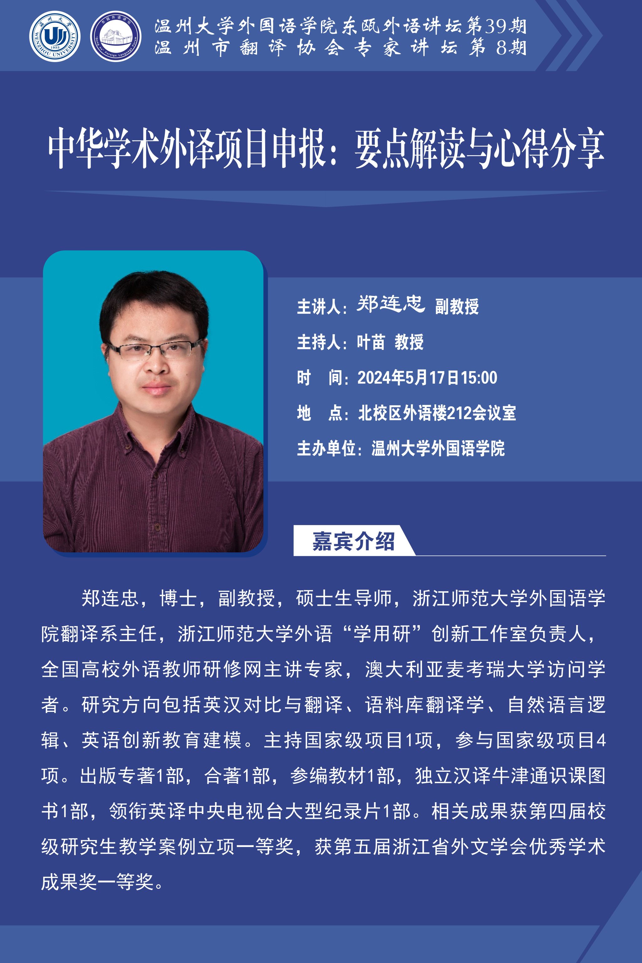 东瓯外语讲坛第39期预告:中华学术外译项目申报:要点解读与心得分享