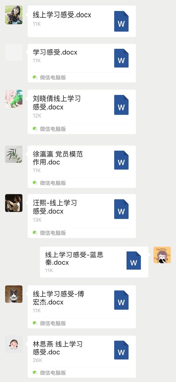 在学习过程中,全体党员回顾了入党的初心,学习了习近平总书记关于疫情系列的讲话和必赢76net线路有关疫情防控的有关文件,撰写了线上学习的“微感受”。“微感受”围绕“对文件精神的理解”,“党员职责的履行”等两方面展开。全体党员都审视了自己在疫情期间的表现以及表达了自己对打赢疫情防控阻击战的信心和决心。