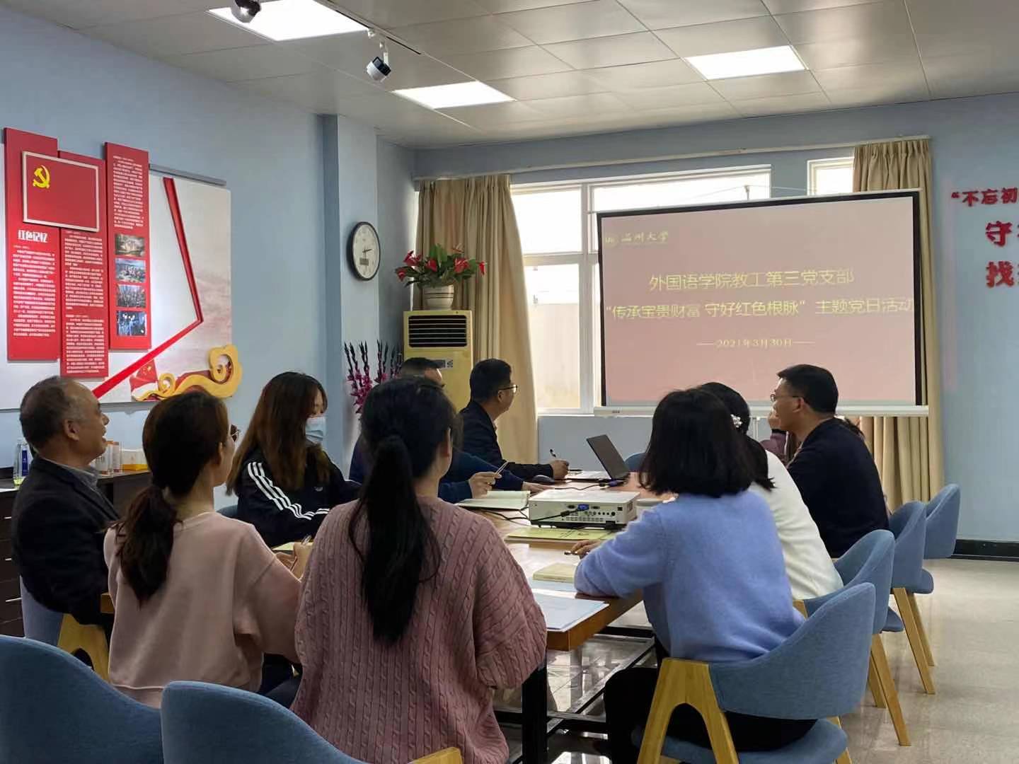 为认真学习、全面贯彻习近平总书记重要讲话精神,深入践行党史教育,3月30日下午,必赢76net线路教工第三党支部在外语楼221党员之家开展了“传承宝贵财富,守好红色根脉”党史学习主题党日活动。本次活动由支部书记何永成同志主持。