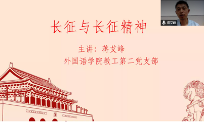会议首先由蒋艾峰老师分享了题为“长征与长征精神”的主题报告。蒋老师和大家分享了长征的基本知识,包括长征的时间、长征的终点以及长征一词的由来。长征从1934年10月到1936年10月,红军队伍踏遍十一个省份,进行了三百多次战斗,冲出敌人的重重包围。因此长征也被称为“突围”、“西征”、“战略转移”等。长征的终点是延安,“延安精神”是对延安圣地的概括描述。蒋老师引导大家认识读书的重要性,启发大家结合长征精神,探索如何成为当代合格的外语人。