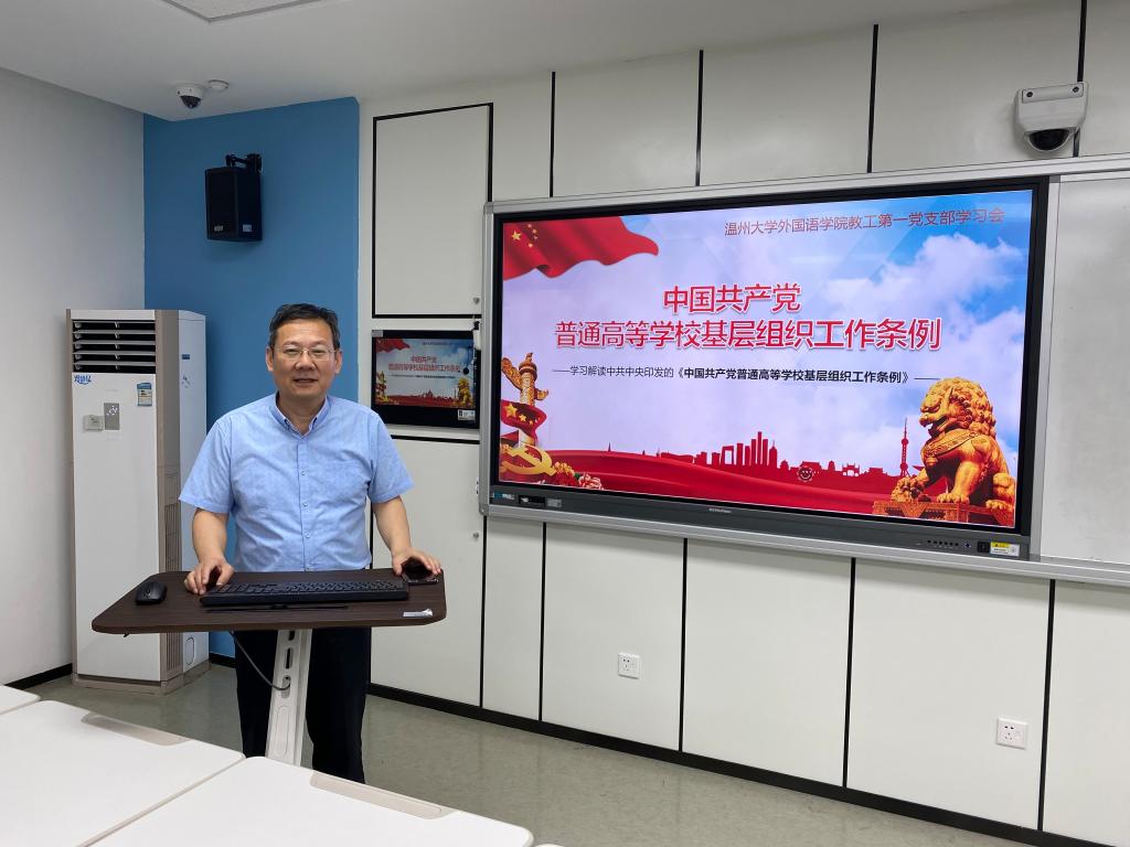 5月26日中午,必赢76net线路第一教工党支部在外语楼210智慧教室召开《中国共产党普通高校基层组织工作条例》主题学习会,全体支部党员参与本次学习会,会议由支部书记毛继光同志主持。