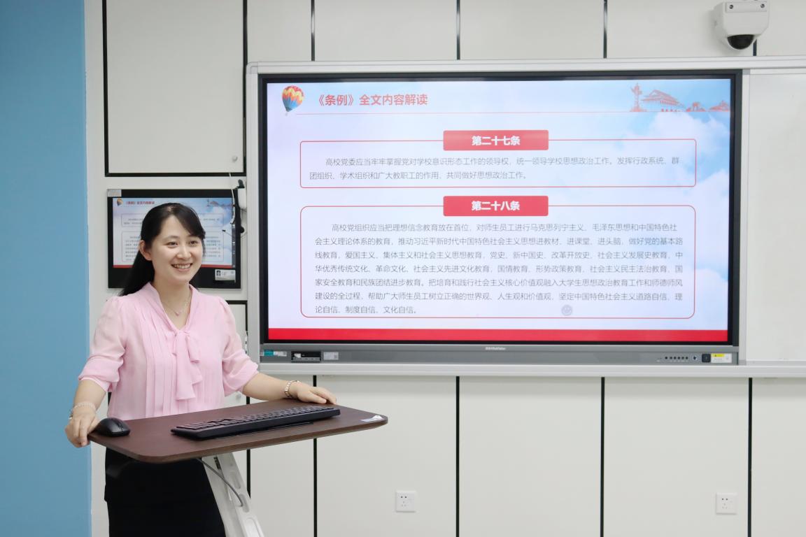接着支部宣传委员童芳莉同志带领全体党员老师一起深入学习了《条例》的组织设置、主要职责、党的纪律检查工作、党员队伍建设、干部和人才工作、思想政治工作、对群团组织的领导、领导和保障、附则等十个章节39条细则。特别是学习到《条例》第二十八条,党员老师们一致认为这是课堂课程思政的重要方面,加深了大家对课程思政的进一步了解。