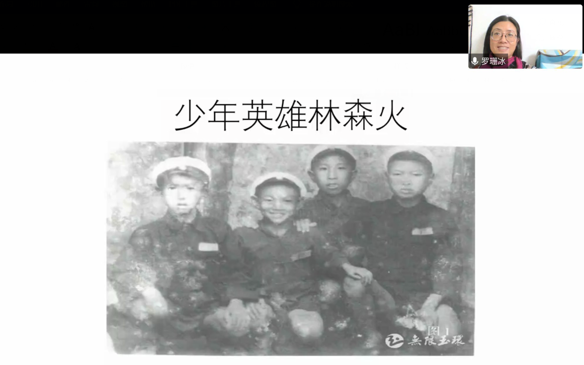 接下来由罗珊冰老师讲党史,罗老师结合自己的家乡,给大家分享了“少年英雄林森火”的故事。林森火(1933年—1950年)是玉环坎门人,机智勇敢,12岁起任玉环市坎门街道儿童团团长、共产党的秘密交通员。曾化装成小贩进入敌军炮楼,为解放坎门街道提供军事情报。1949年加入中国新民主主义青年团。1950年11月20日,在参加反击台湾国民党军骚扰大陆战斗中英勇牺牲。同年当地人民为其修建了烈士墓,中央人民政府主席毛泽东为其颁发了“革命英雄纪念证”,是党中央颁布的十三位“少年英雄”之一。