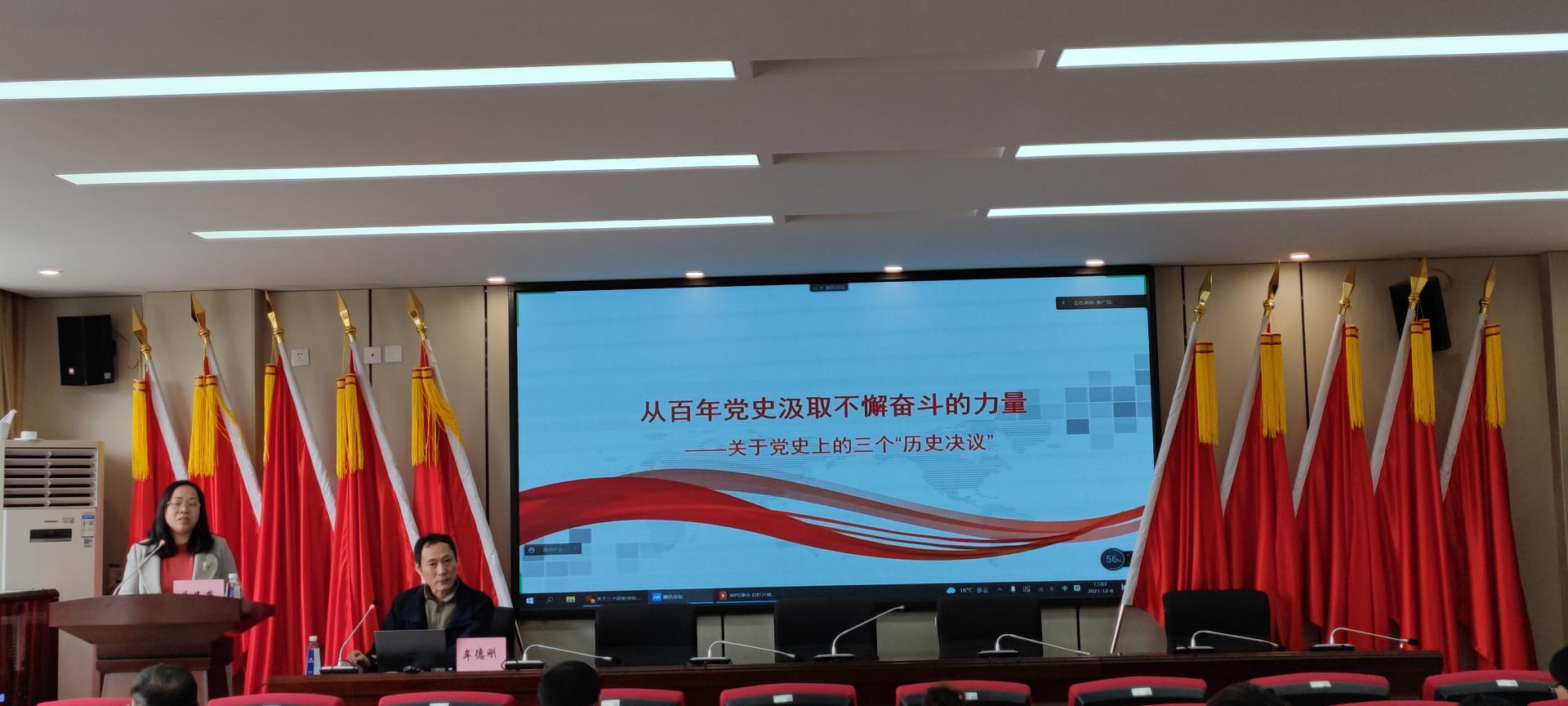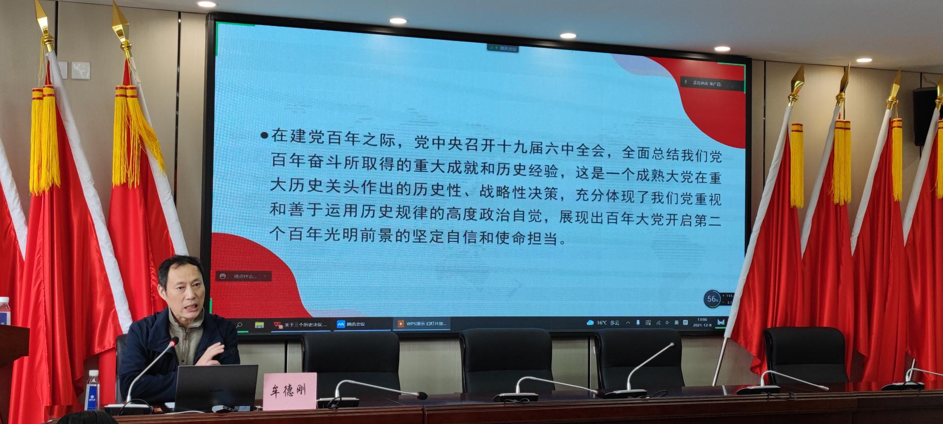 为深入学习贯彻党的十九届六中全会精神,12月8日13:00,公司组织学院全体教工、员工党员、21级本科生以线上+线下的形式开展十九届六中全会学习会。原公司党委副书记牟德刚教授作专题报告,公司党委书记姜海燕老师主持会议。
