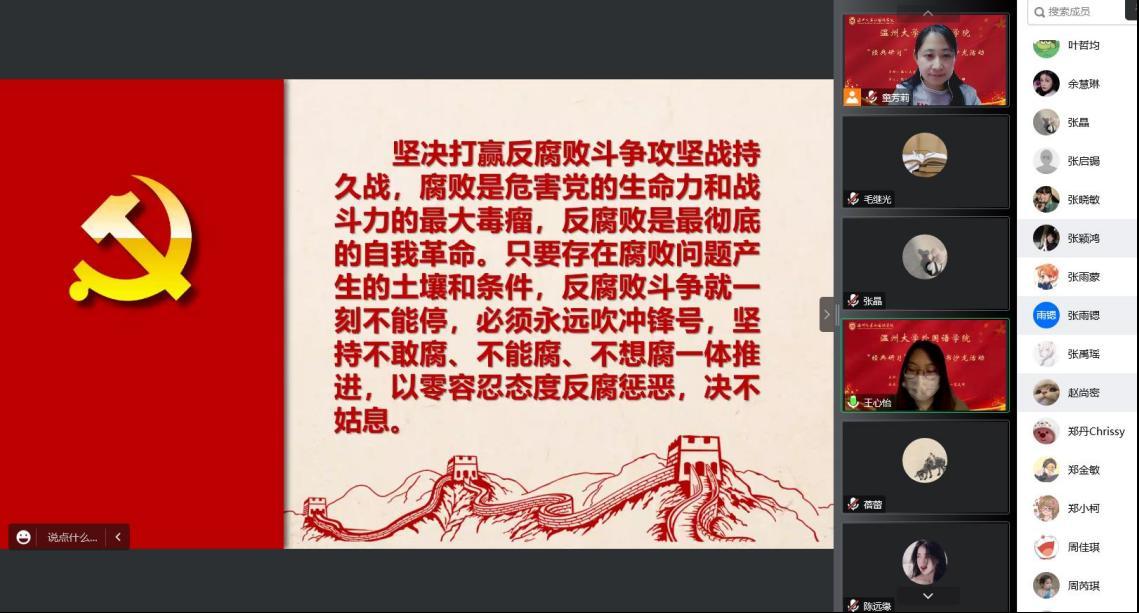 来自22级英语专升本2班的王心怡同学从反腐倡廉讲起,带领同学们思考作为新时代的青年,我们该如何做到“反腐倡廉”。 她强调了“三个务必”的思想:务必不忘初心、牢记使命;务必谦虚谨慎、艰苦奋斗;务必敢于斗争、善于斗争。来自20级英语师范4班的夏希玥同学则是紧密结合自己的专业学习,用全英文流利地分享了她对“党的二十大”报告学习的个人心得,带领同学们思考当代青年人所应肩负的历史使命。