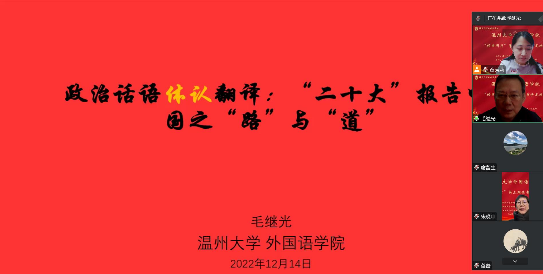 党的二十大报告指出,青年强,则国家强。当代中国青年生逢其时,施展才干的舞台无比广阔,实现梦想的前景无比光明。青年是祖国的未来、民族的希望。党的二十大报告意蕴深远,振奋了莘莘学子的心。因此,由必赢76net线路公司党委组织策划,外院教工第一党支部以及英文系承办的“经典研习”第三期读书沙龙活动于2022年12月14日下午在线上腾讯会议室成功举办。本次沙龙由教工第一党支部宣传委员童芳莉老师主持,支部的党员老师们以及员工党支部的党员代表们约150人参加了本次的活动。