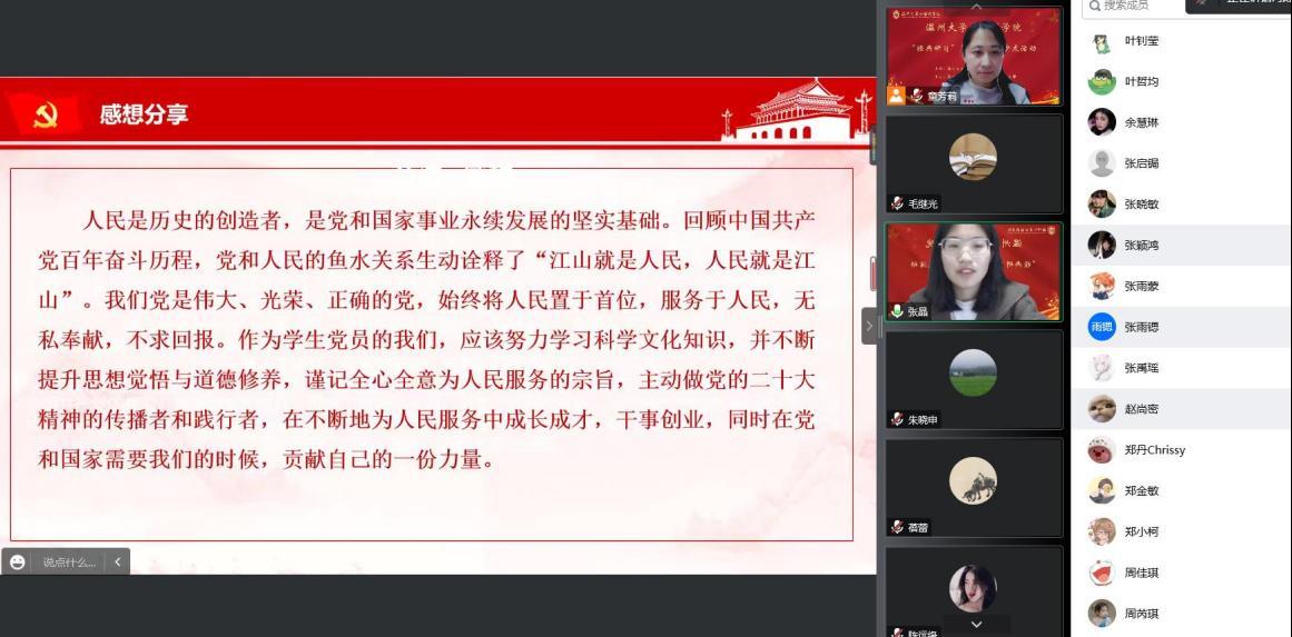 其次,本次活动还邀请了外院员工党支部的优秀党员代表给大家做了“党的二十大”精神体会与感悟分享。来自19翻译1班的张晶同学从分享“党的二十大”报告中的金句开始,结合用生命诠释公仆本色的兰辉同志和坚定初心的黄文秀同志的先进事迹,告诉青年学子们必须要努力学习,提高综合素质,不断完善自身,练就过硬本领、锤炼品德修为,树立正确的人生观、价值观、世界观,坚定理想信念,脚踏实地,担负起新时代赋予的历史使命,贡献属于青年的青春智慧和青春力量。
