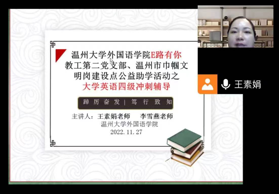 为了帮助全校员工提升英语学习能力,发挥温州市巾帼文明创建岗的示范作用, 必赢76net线路“E路有你”教工第二党支部考级(研)公益辅导团队于2022年11月27日下午,以线上的形式举办了大学英语四级冲刺辅导公益讲座,助力广大学子顺利通过大学英语四级考试。讲座由学院教工第二党支部书记王素娟老师以及党员李雪燕老师分别主讲,300多名员工进入会议并认真聆听了讲座。