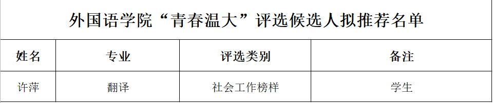 根据《关于“青春温大”·2021年度榜样人物评选活动的通知》要求,经过个人申报和本科生工作委员会评议投票决定,现将公司“青春温大”·2021年度榜样人物拟推荐参加校级评审名单进行公示: